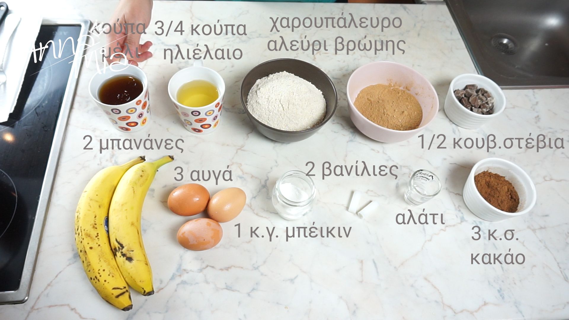 Τι θα χρειαστείτε; 2 μπανάνες, 3 αυγά, 1 κουταλάκι του γλυκού μπέικιν, 2 βανίλιες, λίγο αλάτι, 3 κουταλιές τις σούπας κακάο, 3/4 της κούπας ηλιέλαιο, 1 κούπα μέλι, χαρουπάλευρο (προεραιτικά), αλεύρι βρώμης και μισή κουβερτούρα με στέβια.